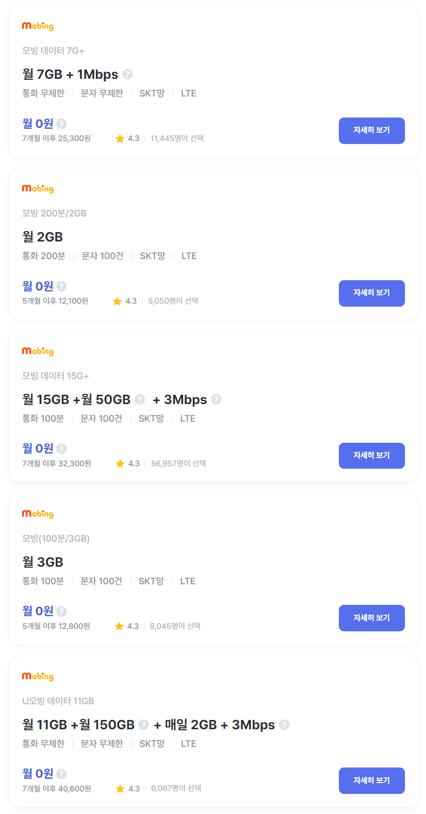 모빙에서 제공하는 요금제는 선택지가 제일 많습니다. KT, SKT, LGU+망이 제공됩니다.