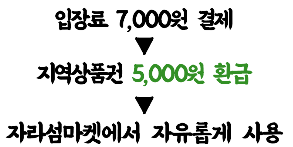 입장료는 7천원이지만, 결제금액의 70%에 해당하는 5,000원을 지역상품권으로 환급해 주기 때문에 실질적인 입장료는 2,000원이라고 할 수 있습니다. 페스타 입구의 자라섬마켓에서 환급받은 5,000원을 자유롭게 사용할 수 있습니다. 마켓에서는 지역상인들이 직접 만든 건강한 먹거리뿐만 아니라 가평에서 생산된 청정 농수산물을 구입할 수 있습니다. 또한, 공예체험, 화훼, 꽃차 등 여러 가지의 다양한 체험이 준비되어 있습니다.