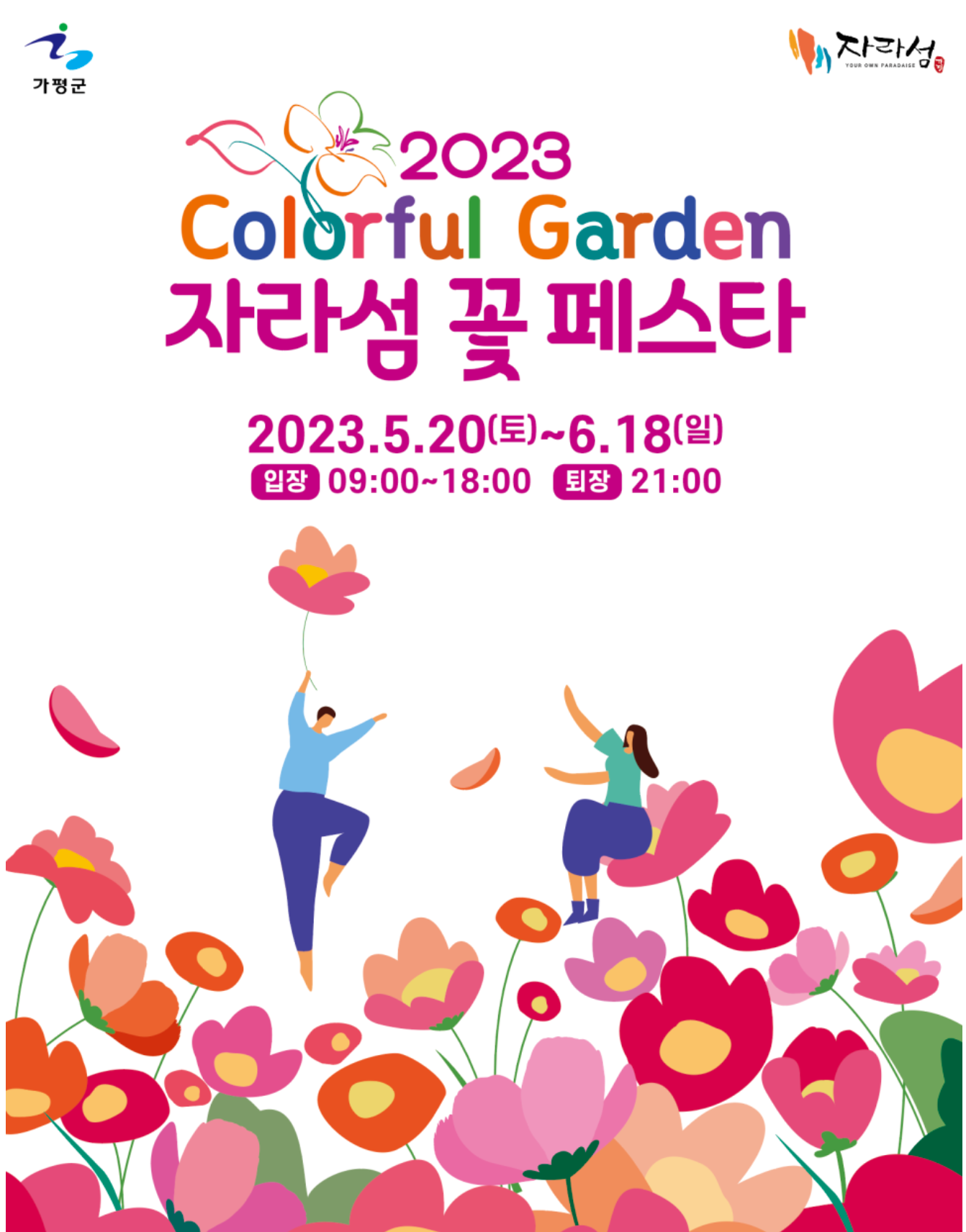 자라섬 꽃 페스타는 2023년 5월 20일(토)부터 2023년 6월 18일(일)까지 진행됩니다. 입장은 오전 9시부터 오후 6시까지 가능하며, 퇴장은 밤 9시까지입니다.