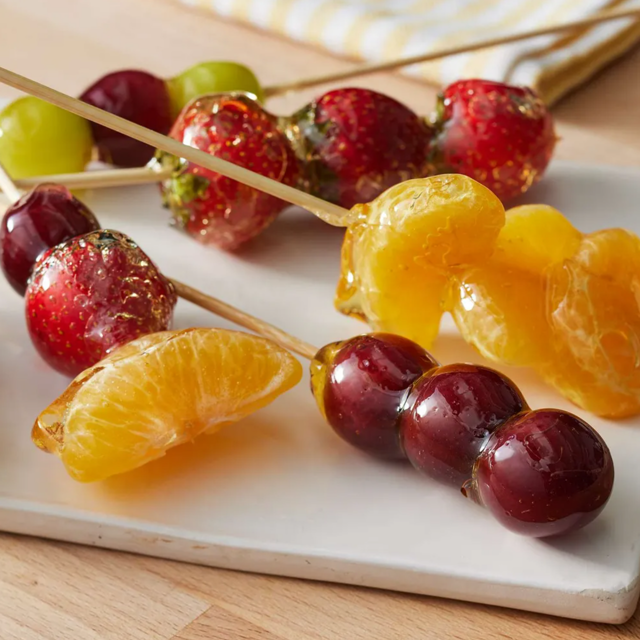 8. 과일 꼬치를 냉장실이나 실내에서 30분 정도 굳혀주면 탕후루가 완성됩니다.